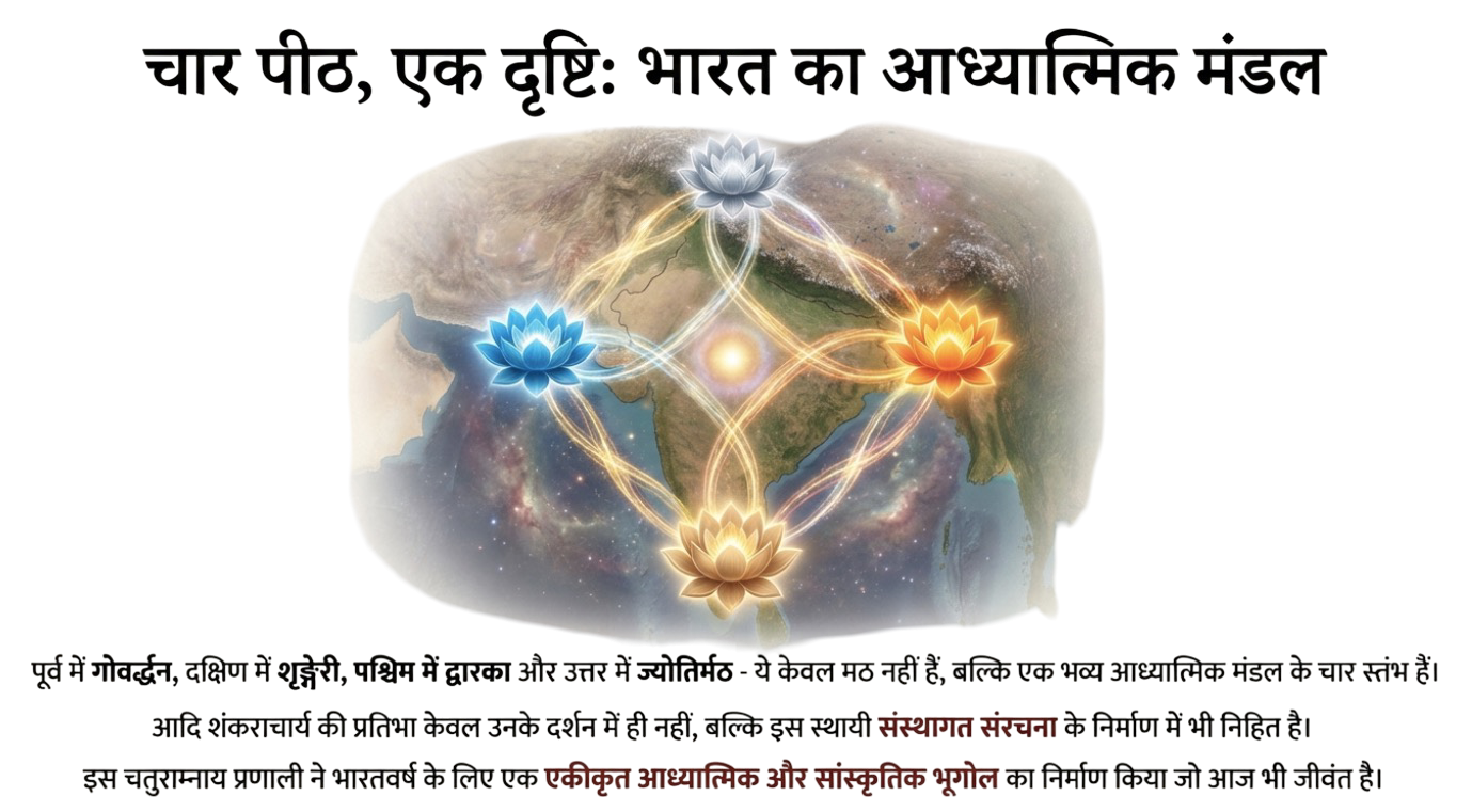 ब्राह्मण, क्षत्रियादि हम शिष्यवर्गकी प्रार्थनाको स्वीकार कर श्रीभगवत्पादने जगन्नाथ, बदरी, द्वारका तथा रामेश्वरम् से सम्बद्ध शृङ्ग – ऋषि क्षेत्रको धर्मराजधानी उद्घोषितकर इनमें क्रमशः भोगवर्द्धन, ज्योतिः, शारदा और शृङ्गेरी मठकी स्थापना की। आपने उन चार धामोंमें ‘योगिजनप्रधान उत्तरदिशामें धर्ममर्यादाकी रक्षा सुगमतासे सम्भव है’, ऐसा समझकर ज्योतिर्मठमें श्रीतोटक जिन्हें प्रतर्दनाचार्यके नामसे भी जाना जाता है उन्हें आचार्यपदपर प्रतिष्ठित किया, ऋषि शृङ्गके आश्रममें तदनुकूल स्वभाववाले श्रीहस्तामलकाचार्य जिन्हें पृथ्वीधरके नामसे भी जाना जाता है उन्हें आचार्यपदपर अभिषिक्त किया; पूर्व दिशास्थित भोगवर्द्धनमें स्वतः ही सिद्ध तथा प्रसिद्ध स्वाभिमतसिद्धिमें अभिनिविष्ट अत्यन्त उग्रस्वभावके होते हुए भी सर्वज्ञकल्प श्रीसनन्दनाचार्य जिनकी प्रसिद्धि पद्मपादके नामसे भी है; उन्हें प्रतिष्ठित किया। द्वारका भगवान् श्रीकृष्णके प्रपौत्र वज्रनाभके द्वारा विनिर्मित तथा जैनके द्वारा ध्वस्त मन्दिरकी दुर्दशाको दूर करनेकी भावनासे त्रैलोक्यसुन्दर भगवदालय विनिर्मित कर उसमें श्रीकृष्णादिको निगमागमसम्मत विधिसे सुसंस्कृतकर प्रतिष्ठित किया। तद्वत् बौद्ध कापालिकादि समस्त वादियोंसे परिपूर्ण पश्चिमदिशाका शोधनकर श्रीभगवत्पादने वैदिक समग्र सिद्धान्तकी प्रस्थापना की; उसमें वादिदैत्यरूप अङ्कुर पुनः उज्जीवित न हो जाय, इस भावनासे सम्पूर्ण लौकिक तथा वैदिक – सिद्धान्तमें निष्णात सर्वज्ञमय विश्वविख्यातकीर्ति विश्वरूपाचार्य जिन्हें सुरेश्वराचार्यके नामसे भी जाना जाता है, उन्हें शारदापीठ द्वारका हम अनुगत शिष्योंके सर्वसम्मत अनुरोधपर आचार्यपदपर अभिषिक्त किया।