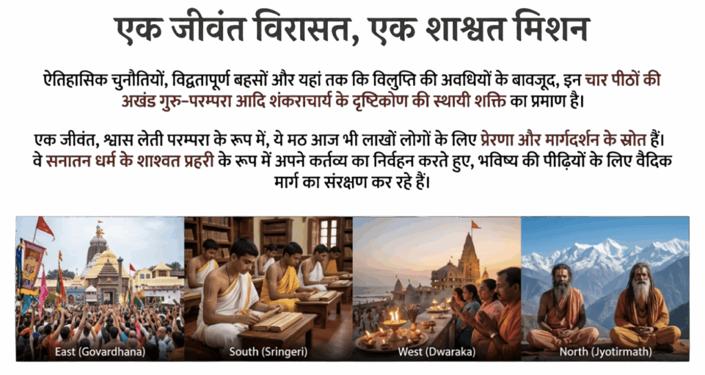 उक्त रीतिसे श्रीभगवत्पादने भारतवर्षकी चार दिशाओंमें चार आचार्योंको अधिष्ठित किया । उन्हें उन्होंने आदेश दिया कि वे इन पीठोंमें उस – उस पीठकी प्रणालीके अनुसार अपने – अपने ही मण्डलकी रक्षा करते हुए वैदिक मार्गको उद्धासित करें और उस – उस मण्डलसे सम्बद्ध हम सब ब्राह्मण क्षत्रियादि उस – उस मण्डलाधिपति आचार्यकी आज्ञाका पालन करते हुए व्यवहार करें। महत्त्वपूर्ण निर्णयकी स्थितिमें सर्वत्र उक्त लक्षणयुक्त होनेके कारण सुरेश्वराचार्य व्यवस्थापक (निर्णायक) हों; यह श्रीभगवत्पादका अनुशासन है। हमारी राजसत्ताके समान ही निरङ्कुश गुरुसत्ता भी उक्त मर्यादाके अनुसार जगत् में अविचल अनवरत चलती रहे, ऐसी हमारी भावना है।
